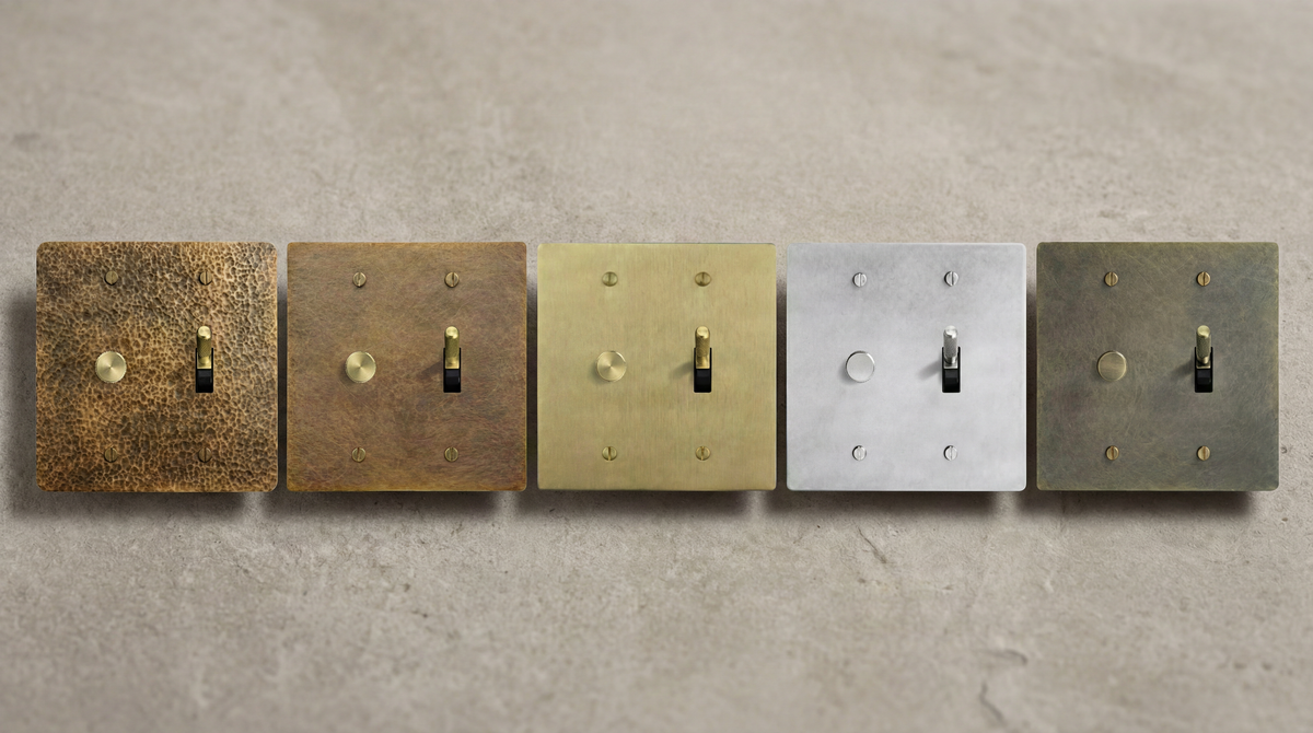 Five luxury 2 Gang Toggle Switches with authentic patina in brass, nickel, and matte black, showcasing fine craftsmanship.