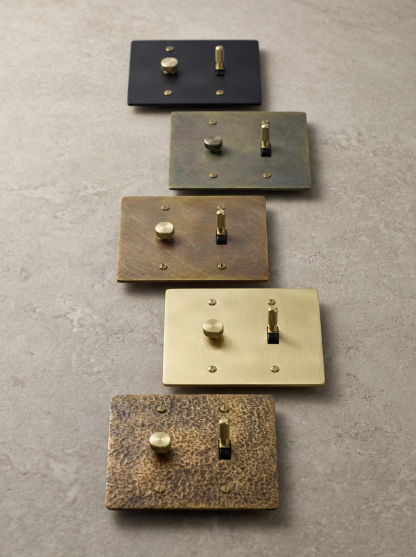 Available in a variety of finishes, including Aged Brass, Matte Black, and Satin Brass. Choose between our modern knurled toggle or classic vintage rotary design. Each 2 gang toggle switch ships with matching brass mounting screws and fits standard US electrical boxes.
