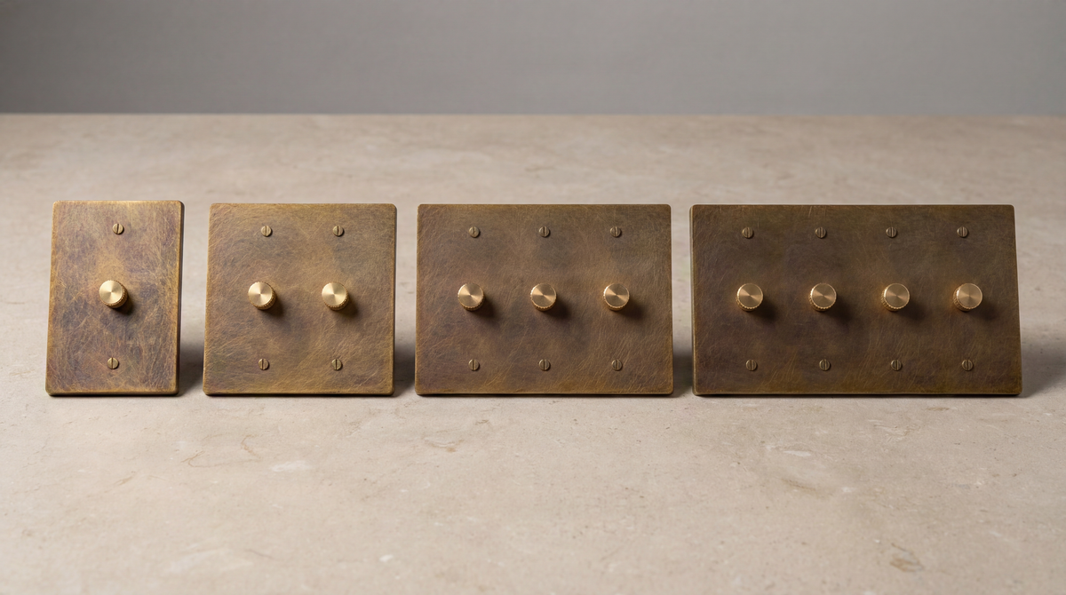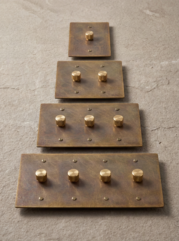 Our aged brass dimmer switches offer precise control and a warm, inviting glow. Crafted from solid brass, these dimmers add a touch of timeless elegance to any space.