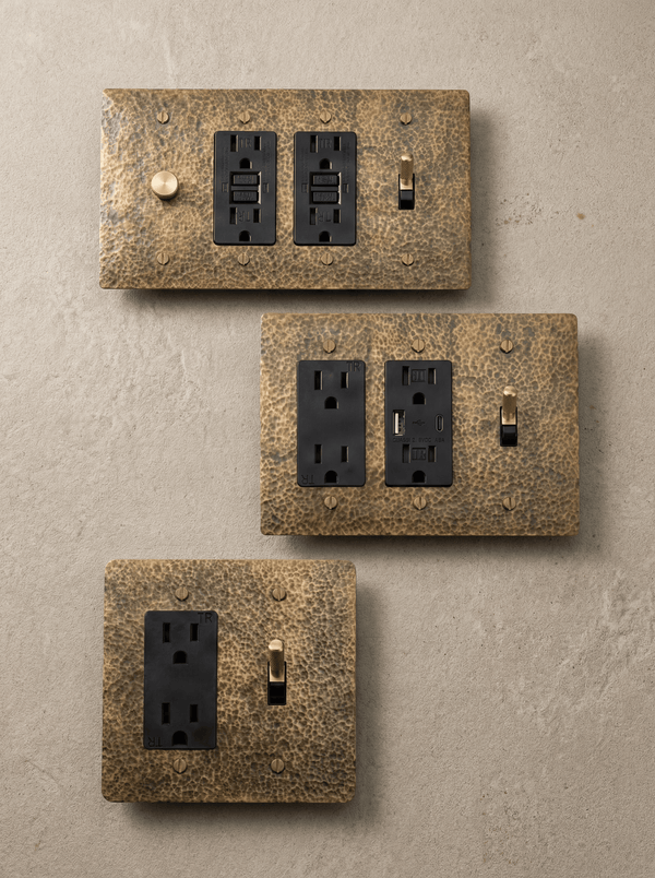 Each hammered brass toggle switch outlet features solid brass construction, ensuring durability for generations. The unlacquered finish develops a rich patina over time, adding character with each touch. UL-certified for both residential and commercial use, these outlets combine safety with timeless appeal.