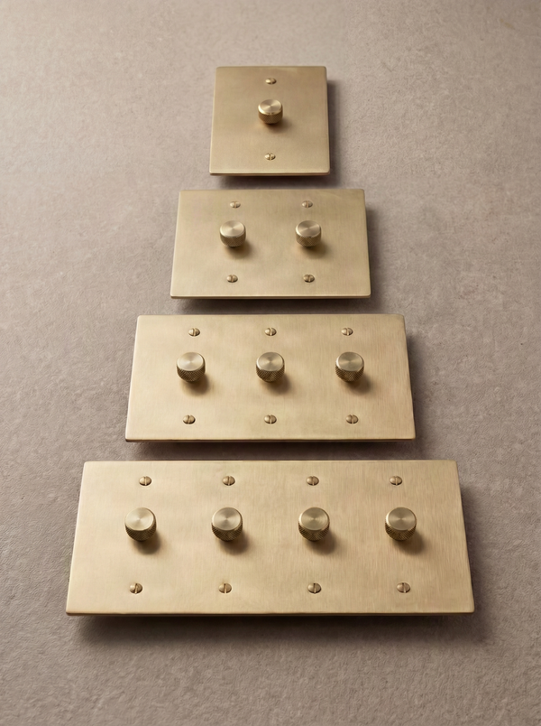 Choose from single-pole or 3-way wiring options to suit your needs. Our satin brass dimmer switches are available in 1 to 4-gang configurations, compatible with standard US electrical boxes. Each switch includes matching brass mounting screws for easy installation.
