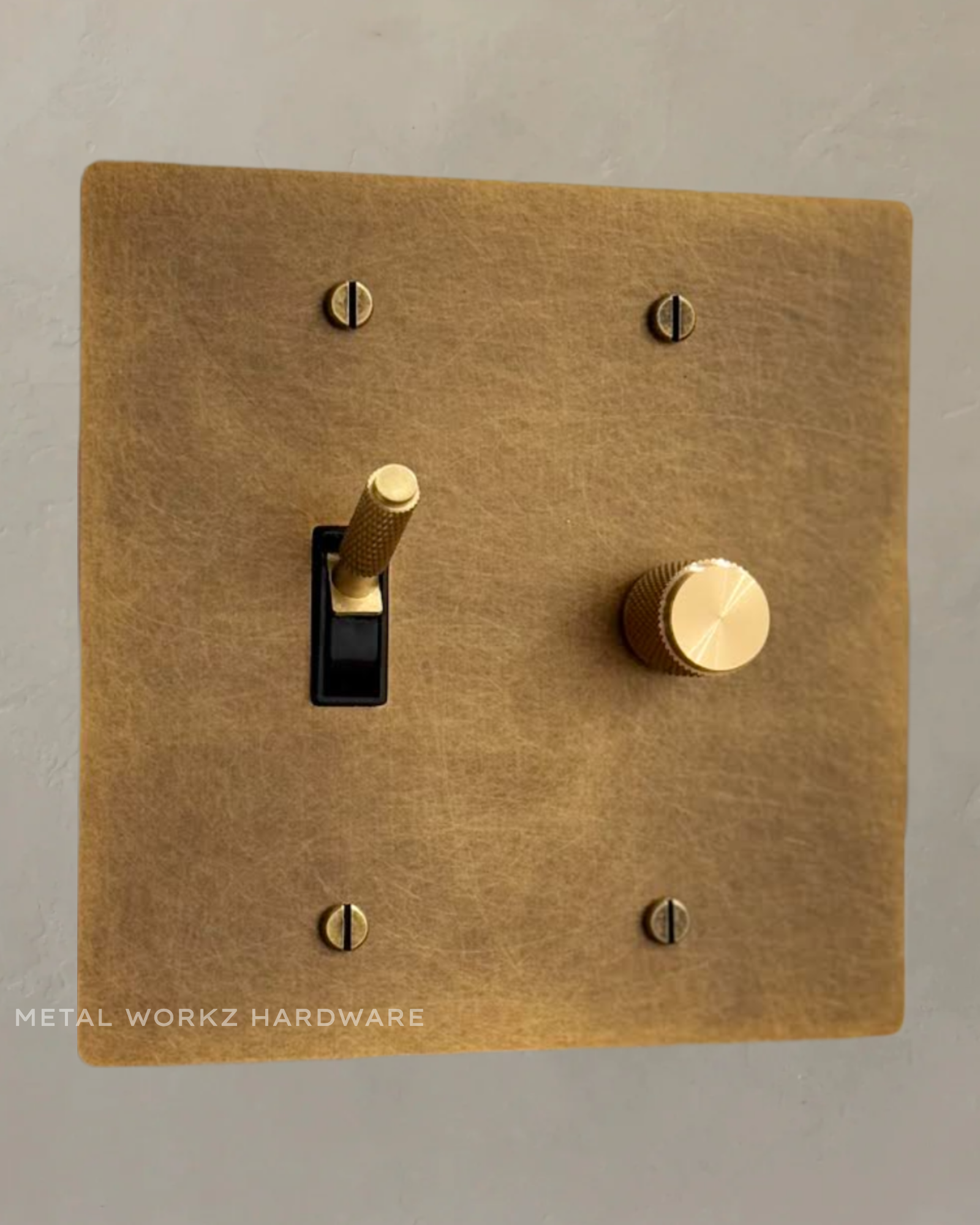 Control your lights with ease using our Brass Modern Knurled Toggle And Rotary Dimmer Light Switch. This 2-gang switch plate features a cross knurled textured toggle and dimmer switch combination for modern convenience. Crafted from solid brass, its sleek and modern design adds a touch of elegance to any space.