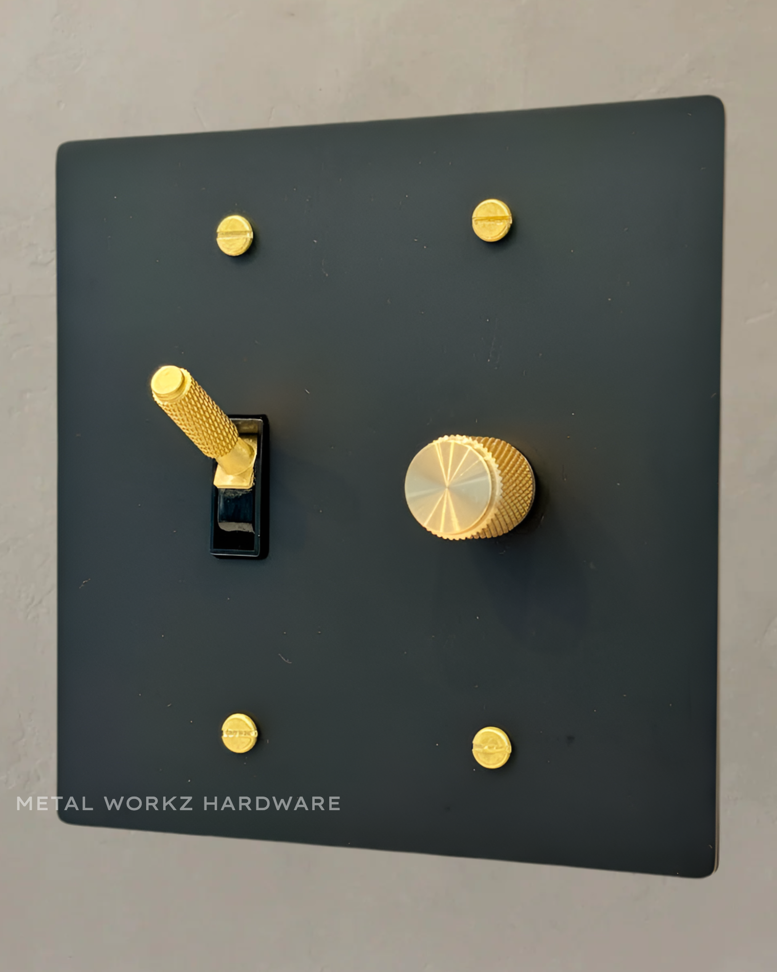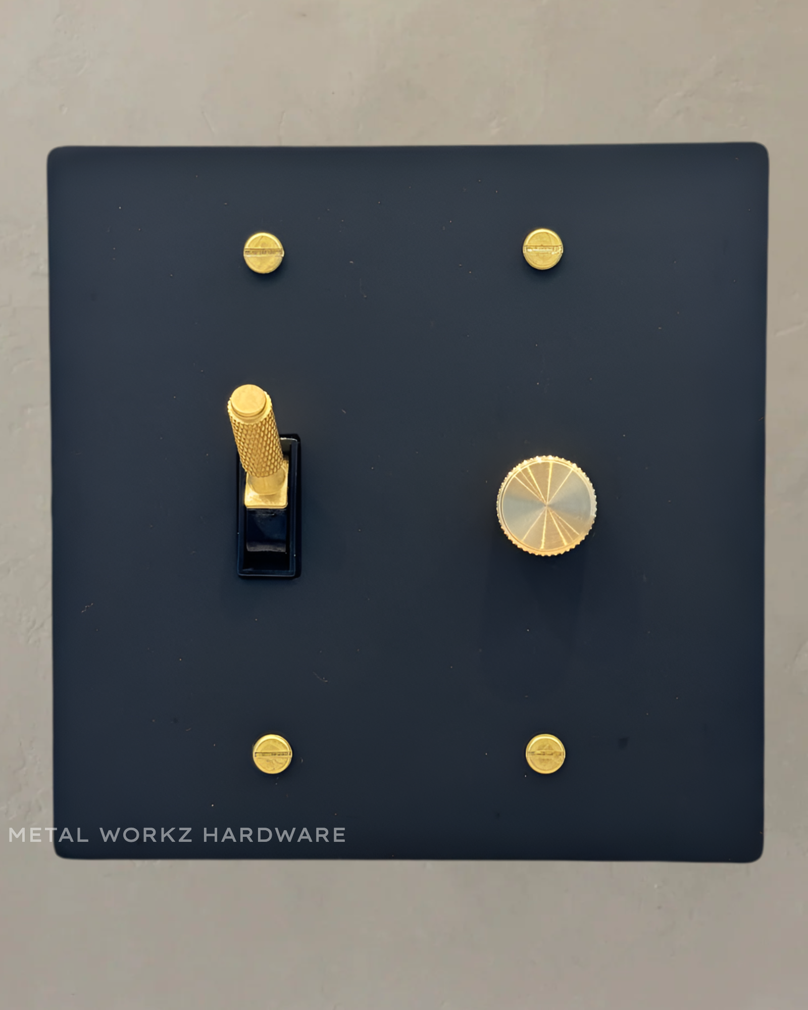 Control your lights with ease using our Brass Modern Knurled Toggle And Rotary Dimmer Light Switch. This 2-gang switch plate features a cross knurled textured toggle and dimmer switch combination for modern convenience. Crafted from solid brass, its sleek and modern design adds a touch of elegance to any space.