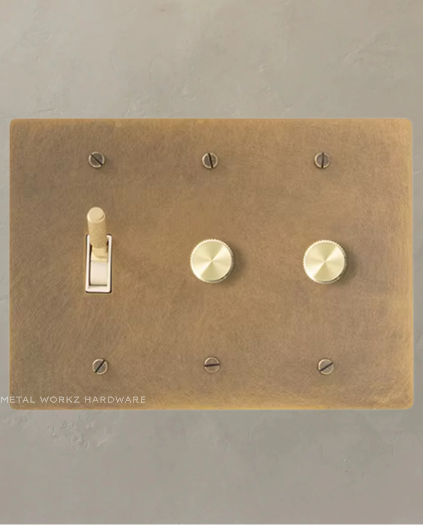 Control your lights with ease using our Brass Modern Knurled Toggle And Rotary Dimmer Light Switch. This 3-gang switch plate features a cross knurled textured toggle and dimmer switches combination for modern convenience. Crafted from solid brass, its sleek and modern design adds a touch of elegance to any space.