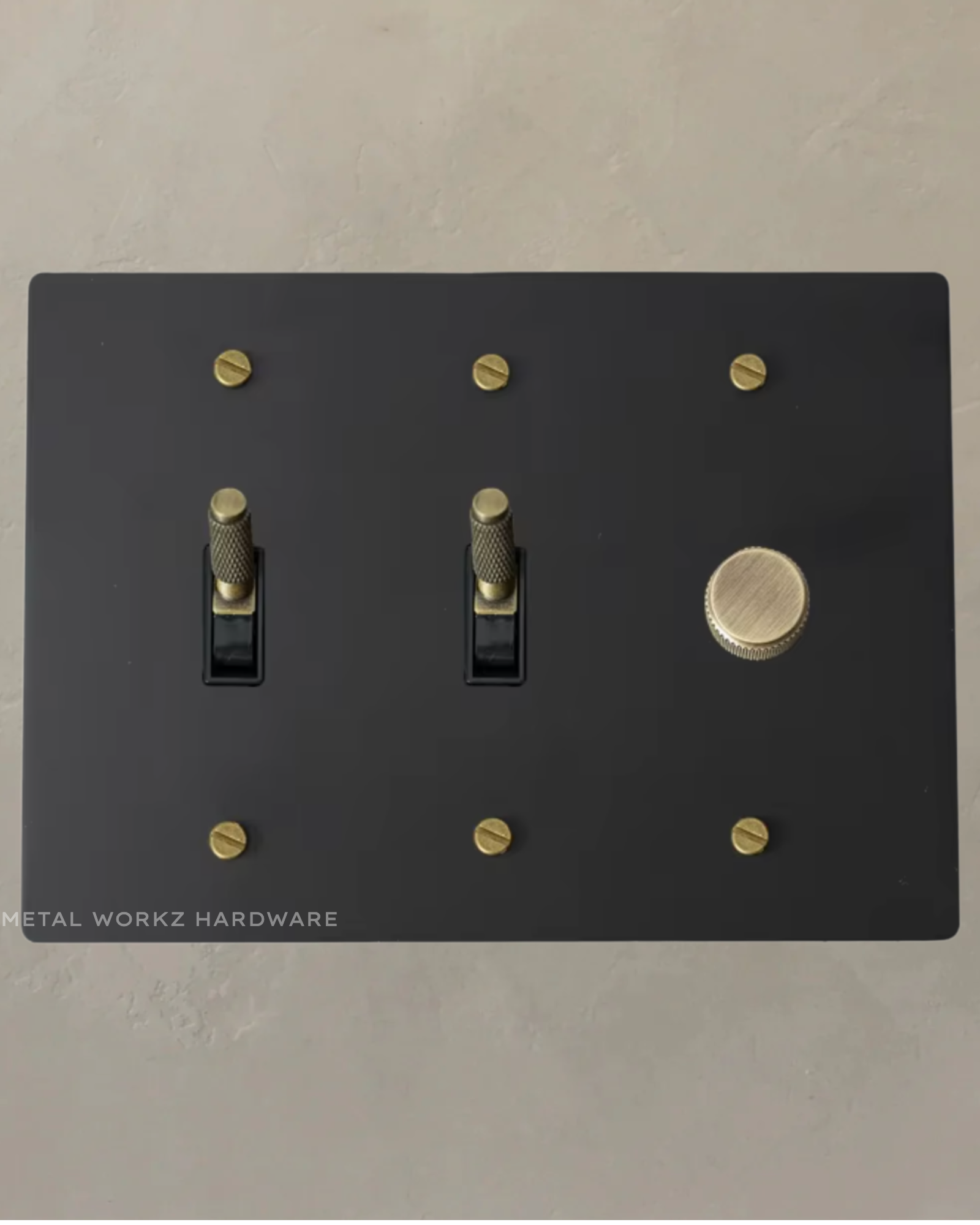 Control your lights with ease using our Brass Modern Knurled Toggle And Rotary Dimmer Light Switch. This 3-gang switch plate features a cross knurled textured toggles and dimmer switch combination for modern convenience. Crafted from solid brass, its sleek and modern design adds a touch of elegance to any space.