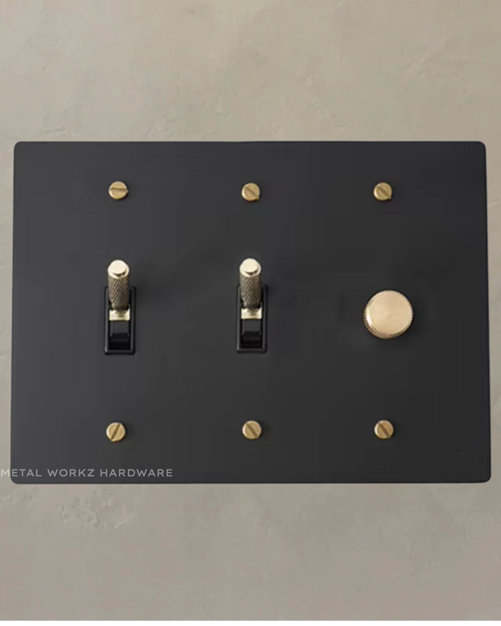 Control your lights with ease using our Brass Modern Knurled Toggle And Rotary Dimmer Light Switch. This 3-gang switch plate features a cross knurled textured toggles and dimmer switch combination for modern convenience. Crafted from solid brass, its sleek and modern design adds a touch of elegance to any space.