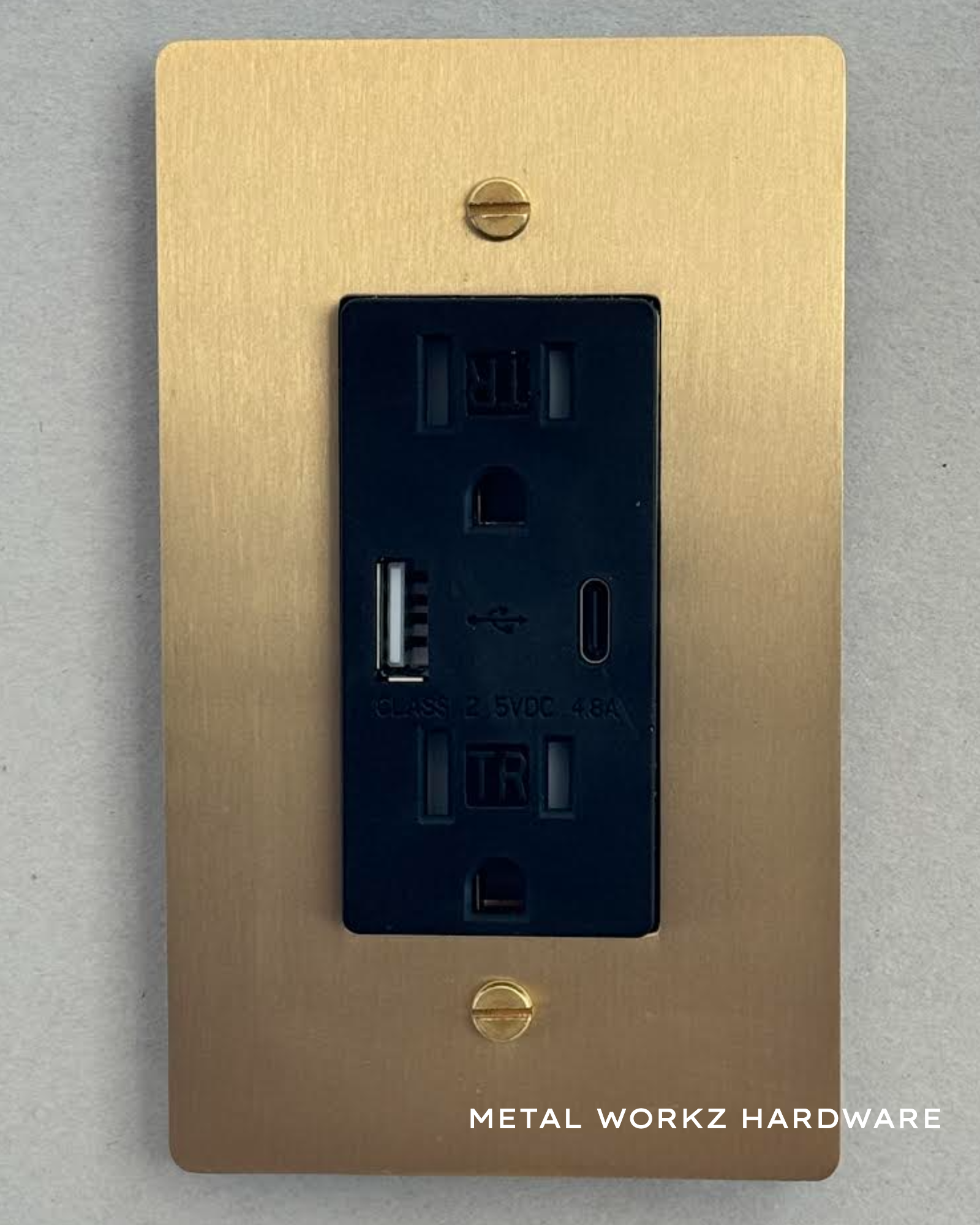 Upgrade your home with our Solid Metal Brass USB/ Type C Duplex Electrical Outlet. Made from high-quality brass, this modern outlet is not only durable but also adds a touch of elegance to any room. With multiple options to choose from, including standard 15A, GFCI, and USB/Type C outlets, you can customize your electrical needs. Keep your family safe with the tamper-resistant design. Pair them up with our dimmer and toggle switches in matching finishes.