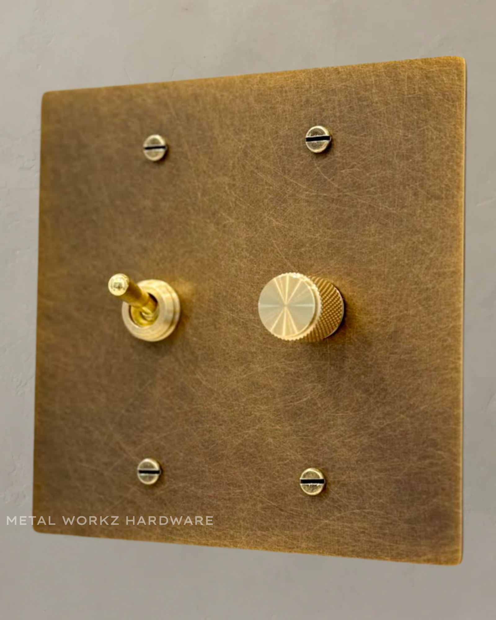 Introducing our Brass Vintage Toggle Switch + Dimmer Switch in Aged Patina Brass. Made of solid brass, this duo combines an elegant and modern design with maximum functionality. Featuring our vintage toggle switch and knurled dimmer rotary switch, experience effortless control and a sleek look.