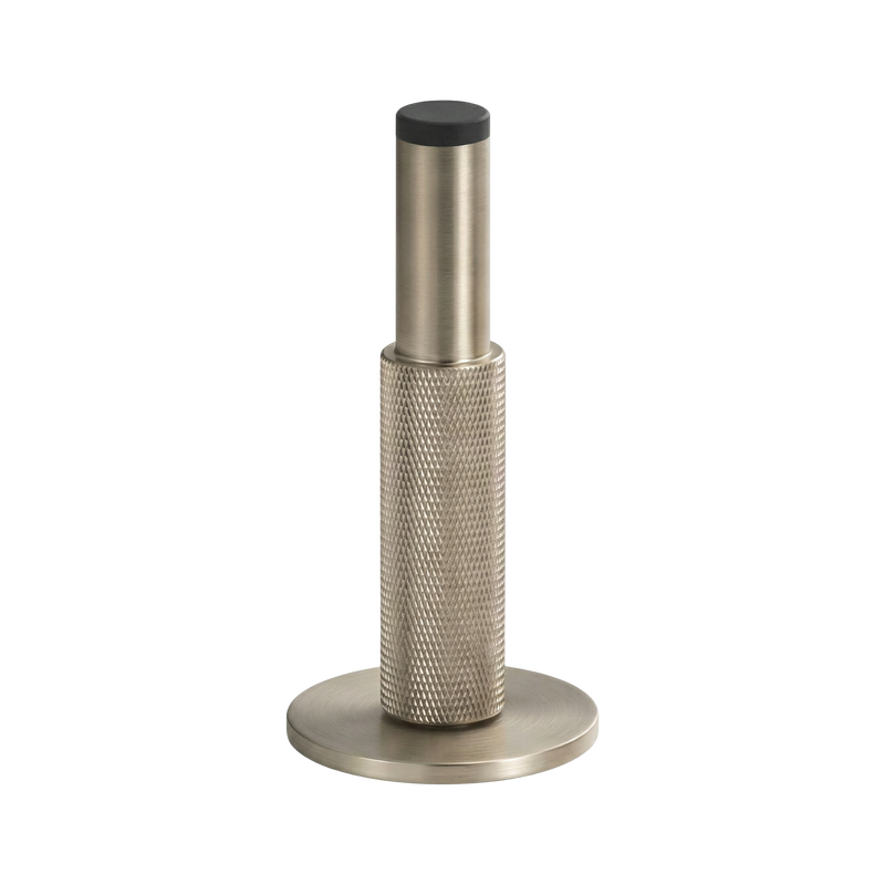 This modern satin nickel wall mount door stop is precision-machined from solid brass for a lifetime of service. Its knurled satin nickel wall mount door stop design offers a tactile elegance that complements any interior. Each piece is hand-finished to ensure a soft luster, adding a layer of quiet luxury and permanence to your daily interactions.